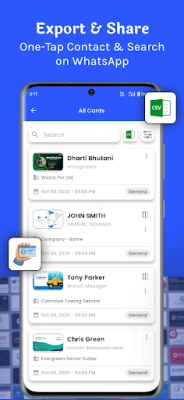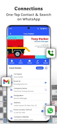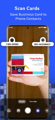 Scan business cards using your phone's camera in real time, or import card images from your photo gallery. Works with printed, digital, and multilingual cards.