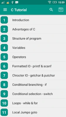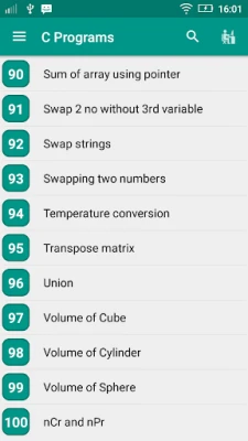 1. Complete C Tutorials. 2. Large Collection of C Programs with Output. 3. FAQ (Interview Questions and Answers) 4. Simple User Interface. 5. Search Tutorials and Programs. 6. Share Tutorials and Programs with Single Click.