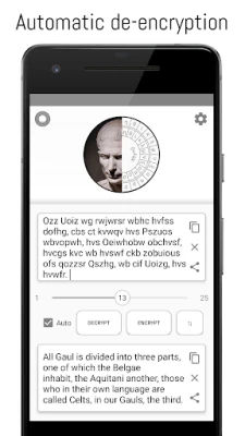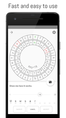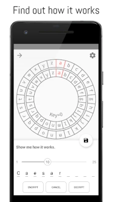 The app allows you to encrypt or decrypt text with the simple and widely known Caesar cipher. If you have an caesar encrypted text with a unknown key, the application can decrypt the text for you! This might be useful for riddles or geocaching. Furthermore, the algorithm is visualized with an interactive cipher disk which you can export and print to craft your own paper cipher disk.