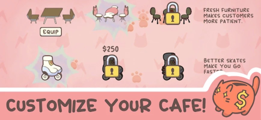 Clawsome Features: 🐱 Choose your character! (-_-) 🐱 Serve yummy food fit for a feline! (˵✪ᆺ✪˵) 🐱 Meet cute and adorable cat customers with 6 unique personalities!(Φ ω Φ) 🐱 Unlock fresh furniture and speedy skates! ₍⸍⸌̣ʷ̣̫⸍̣⸌₎ 🐱 Save up money to upgrade your cafe! (=`ω´=) 🐱 Jam out to some awesome music and charming sounds!(=´∇`=)