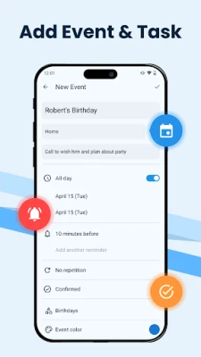 Set custom reminders for tasks, meetings, events, and appointments. Choose flexible notification times — from minutes to days in advance.