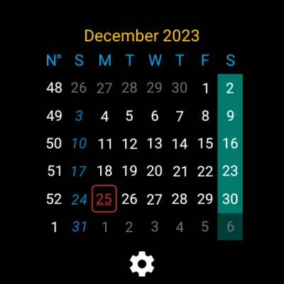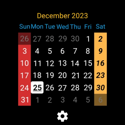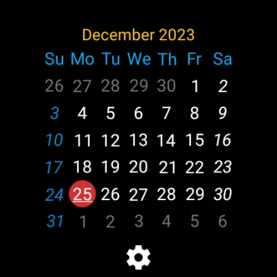 Calendar is a customizable standalone calendar for Wear OS 2.0+. Everything from the background color to the color of the days can be customized.