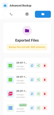 Restore call logs anytime from .bak files.
