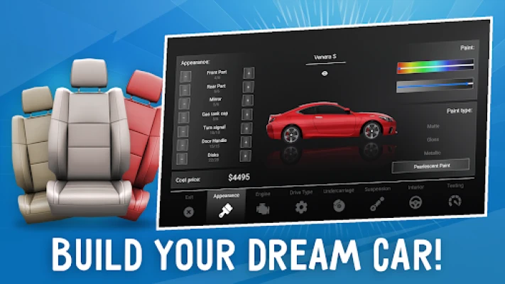 Create the car of your dreams: want a premium sedan? A sports coupe? A passable SUV? Or a family hatchback? Many common types of bodies with their settings are available for construction.