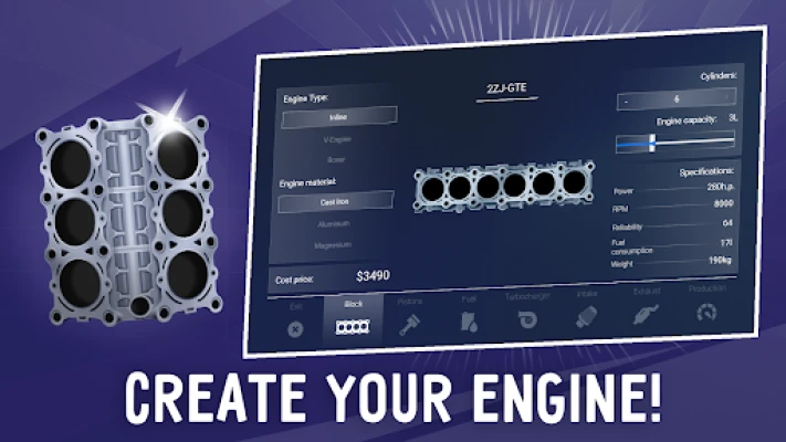 Create the perfect engine for your car: whether it's a large and powerful V12 or a small but efficient in-line 4-cylinder engine, almost all common engine layouts, various turbocharging systems are available for construction. Use detailed engine settings to improve its performance.