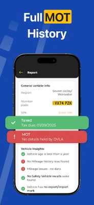 Car check is your valuable auto information app. More than just a VIN check app but a coverall car identifier. With this vehicle information app, you can learn important details about the vehicle you are going to purchase. Here, you will get full car info about any vehicle registered in the UK. Starting from VIN info and MOT history provided in an info vehicle history report and ending with individual insolvency status you can get with additional checks.