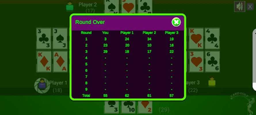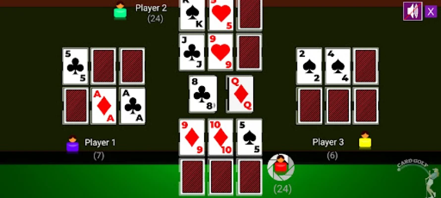 The object is for players to reduce the value of the cards in front of them by either swapping them for lesser value cards or by pairing them up in columns with cards of equal rank and trying to get the lowest score. The highest score loses the game and the lowest score wins the game. A total of 9 rounds are played. Beginning at dealer's left, players take turns drawing single cards from either the stock or discard piles. The drawn card may either be swapped for one of that player's 6 cards, or discarded. If the card is swapped for one of the face down cards, the card swapped in remains face up. If the card drawn is discarded, the players turn is passed. The round ends when all of a player's cards are face-up. Game is nine "holes" (rounds), and the player with the lowest total score is declared winner. Points for Cards Cards Joker is -2 Ace is 1 King is 0 Jack and Queen are 10 Other cards have face value