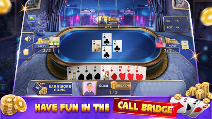 Callbridge is similar to Callbreak. Each player matches the suit if possible, and spades serve as trump cards. Reach 13 points first to win in this challenging game of strategy and skill.