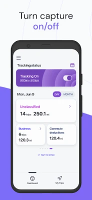 You can accomplish most important tasks from the Driver Dashboard. In just seconds, you can stop or start trip capturing, manually start a trip, check today’s trip capture schedule, and review a summary of your mileage so far this month.
