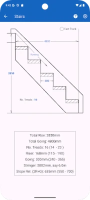 The app will complete difficult calculations for roofing, stairs, raked walls, concrete post holes and slabs, concrete stairs, cladding, decking, balustrades (level and raked), trigonometry and that's just the tip of the iceberg.