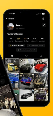 Avec Carspot, vous faites partie d'une communauté de passionnés qui partagent votre amour de l'automobile. Suivez d'autres utilisateurs, découvrez leurs dernières trouvailles et échangez avec eux sur vos modèles préférés. Vous verrez même les repérages les plus récents de vos amis directement dans votre fil d'actualité. De quoi alimenter des discussions sans fin entre connaisseurs !