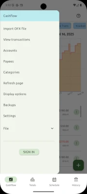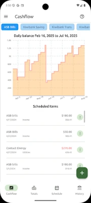 Cashflow will create account balance projections from scheduled transactions, and provide an analysis of banking transaction data you import from OFX files exported from your internet banking site. The cash flow graph shows an itemised schedule day by day with the forecast balance for either a single account, or a selected group of accounts.