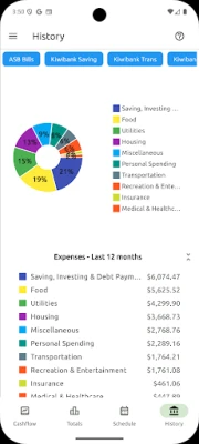 Historical banking transaction data imported from OFX files can be categorised using the built-in categories, or those that you create, so you can view categorised totals over a selected period, as grand totals with a pie chart, and month by month bar chart of totals, or a specific category with a drill down to view all the transactions that make up the total for the month.