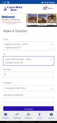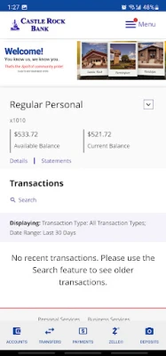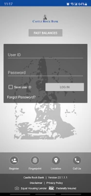 FEATURES: The Castle Rock Bank Mobile Banking App is fast, convenient, and free and allows users to: • Check account balances • See recent activity • View transaction history • Transfer money between accounts • Locate and get directions to ATM and branch locations using GPS • Deposit checks by taking a picture of the front and back of the check