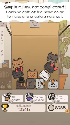 Cats love boxes. It is a merge puzzle with simple rules that when cats of the same color meet, they become cats of the next color. Make the highest cat and get high score. If the cat reaches the limit line, it's game over.