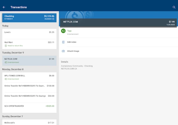 Add Tags, Notes, Images & Geo-Information: By enhancing transactions with custom tags, notes or photos of a receipt or check, you have the ability to stay organized and find exactly what you’re looking for when searching through your finances.