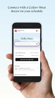 Cedars-Sinai Connect delivers remarkable care that fits your lifestyle, with Cedars-Sinai virtual doctors available 24/7—nights, weekends, and holidays included. Connect with a Cedars-Sinai doctor in minutes or on your schedule, with virtual and in-person interactions fully integrated for an effortless experience.
