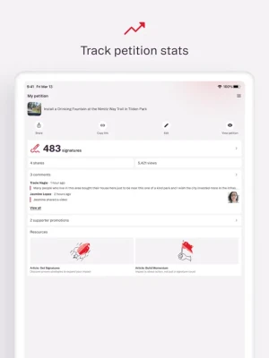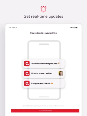 Our new app gives you everything you need to launch and grow a successful petition. Whether you’re fighting for local change or global impact, our app makes it simple to track, share, and amplify your campaign—all in one place. Stay informed with real-time updates when your petition reaches key milestones, so you can celebrate and engage with supporters right away.