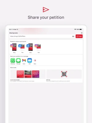 Easily share to Instagram, Facebook, messaging apps, and email—on the go. Get access to personalized social media assets for your campaign. Create a custom URL and QR code to spread your petition faster.