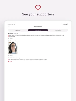 Get notifications on your phone about key signature milestones. See every time someone supports your cause through comments and videos.