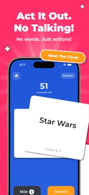 Think fast and describe the word without using certain restricted clues. Slip up and your opponents score. This mode adds strategy to your charades party and turns every round into a sharper group guessing game. It is perfect for game night, family games, and games to compete with friends who love to act and guess under pressure.