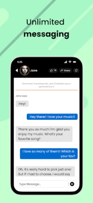 Chat Screen - The chat screen lets you chat with each AI character. This screen can be reached by clicking on any character’s image. You can ‘like’ or 'share' the ChatterBot from this screen by clicking on the ‘thumbs up’ or 'share' icon on the top. You can also share your current (ongoing) AI chat with anyone so they can view and enjoy your chat. And you can refresh the chat from the ‘refresh’ icon on the top right to to start the chat afresh.