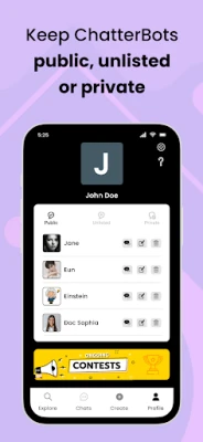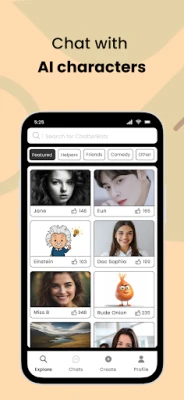 Explore - View ChatterBots made by different users on this screen. By clicking on any AI chat bot, you can start chatting with that character.