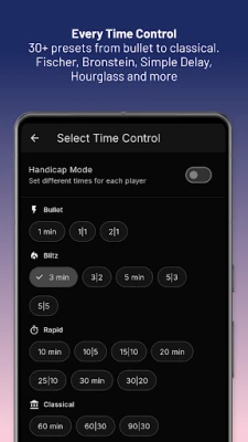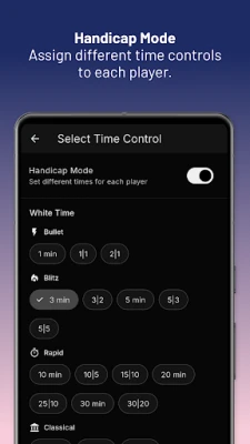 Set different time controls for each player. Any combination of presets or custom settings can be assigned independently to White and Black.