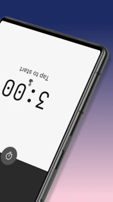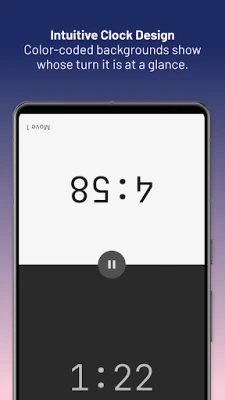 Player 2's display is rotated 180 degrees so both players face the screen. The active player is always clear through background color changes and text color coordination. A pulsing "Tap to start" or "Tap to resume" indicator guides gameplay. When time runs low, the display flashes red. At game end, the winner shows in green and the timed-out player in gray.