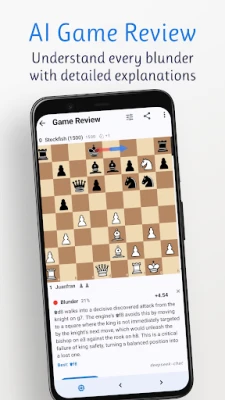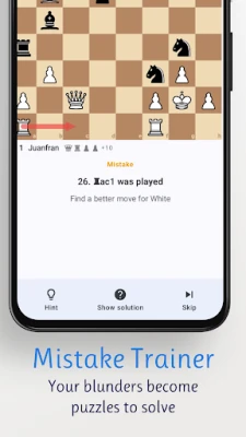 Enable Coach Mode against Stockfish for real-time AI chess coaching. Every move classified as Best, Good, Inaccuracy, Mistake, or Blunder — with explanations. Request hints without spoiling the answer.