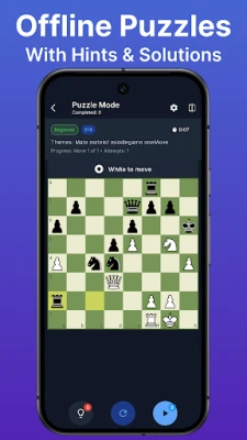 One of the strongest features of this free offline chess app is the puzzle collection. Chess puzzles are the best way to train your mind and sharpen your tactical skills. This app includes thousands of offline chess puzzles so you can play anytime, even without internet. Puzzle categories include mate in 1, mate in 2, sacrifice, middlegame, endgames and random puzzles for all levels.