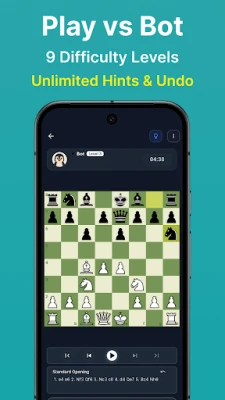 The chess app comes with a powerful bot opponent. You can play chess against the computer with 9 difficulty levels. Beginners can start on easy mode to learn the basics, while experienced players can challenge stronger levels. Playing against the bot helps you practice strategies, tactics, and openings at your own pace.