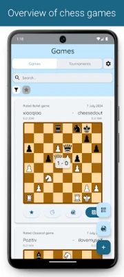An overall overview displays all entered games. You can filter games by tournament, round, and favorites. Additionally, there is a search field allowing you to filter games by players or game descriptions.