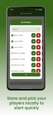 Store and manage your player database in a dedicated section, allowing you to quickly select and add players to tournaments for a faster setup experience.