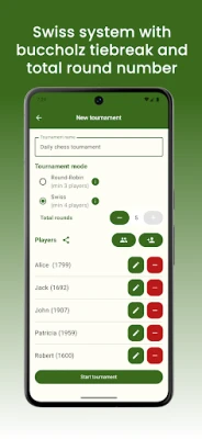 In Swiss mode, players' Elo ratings are automatically updated after each round, providing accurate and real-time rankings.