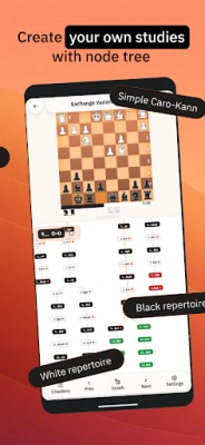 Master lines faster with an SM2 spaced-repetition system that automatically schedules reviews at the right time based on your performance. Keep studies private for personal prep or publish them for the community, and copy public studies into your private database to customize freely. Track progress on a clean dashboard, get smart reminders, and personalize your experience with board and piece themes, light/dark mode, and language options.