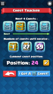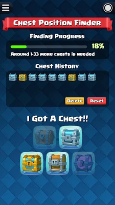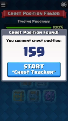 Before start using the chest tracking, you must know your current chest position in Clash Royale. I believe that most of you have already forgot how many chests you have opened so far. No worry, we have integrate a feature named "Chest Position Finder" to help you find out your current chest position in Clash Royale.