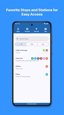 Features: • Real-Time CTA Bus Tracking: See live arrival times and watch buses move along their routes in real time. • Live ‘L’ Train Tracking: Get up-to-the-minute arrival predictions and follow trains as they approach your station. • Nearby Stops & Stations: Instantly find the closest bus stops and train stations around you. • Favorites: Save your most-used stops and stations for one-tap access. • Interactive Map: Search the full CTA map to explore all bus stops and train stations across Chicago. • Accurate ETAs: Reliable predictions so you’ll always know when to head out. • Clean User Experience: Minimal, simple to use interface.