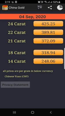 Features: - English - Currencies Chinese Yuan (CNY) - Karats 24k, 22k, 21K, 18k, 14k and more - Calculator for Gold prices - Charts for -- Live Rates as of now -- 30 Days -- 60 Days -- 6 Months -- 1 Year -- 5 Year -- 10 Year - zoom in/out for charts and graphs - HD / retina display
