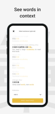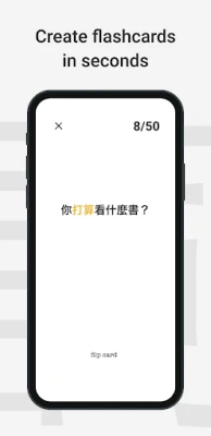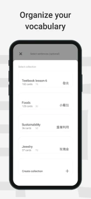 Serica comes with a built-in Chinese / English dictionary which means you can create flashcards from any word definition or example sentence. In just a few taps you can create a flashcard and add it to the collection of your choice.
