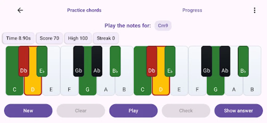 • 🎯 Practice Mode: build the prompted chord on the on-screen piano, chase high scores, and use optional beginner hints