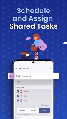 Build color-coded tasks with custom icons and flexible schedules (daily, weekly, monthly, or alternating). They can be assigned to one or more profiles, rotated between family members, or left open for whoever claims them first. Add notes, reminders, categories, and subtasks for better organization.