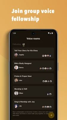3. Join Virtual Fellowship: Participate in group voice rooms for prayer, Bible studies, and faith-based discussions with Christians worldwide, fostering a global Godly community.