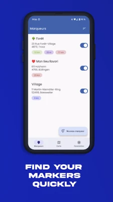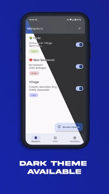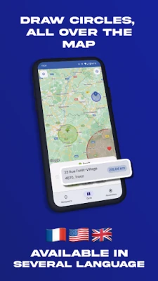 Add as many addresses as you want on the map to then display colored circles with the radius you want in kilometers around these addresses.