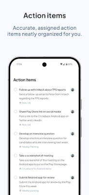 It records your meetings and provides a state-of-the-art transcript with automatic speaker identification, meticulous notes, and assigned action items.