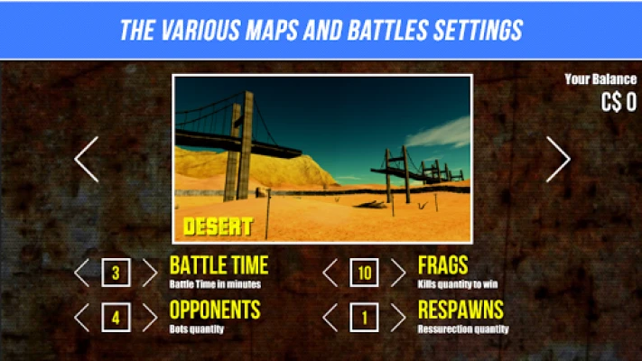 - The ability to choose the number of frags, bots, respawns and time battle.