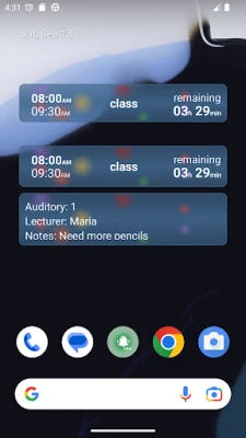 - Countdown display: The widget clearly shows the remaining time until the next class, right on your phone screen.