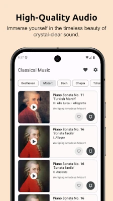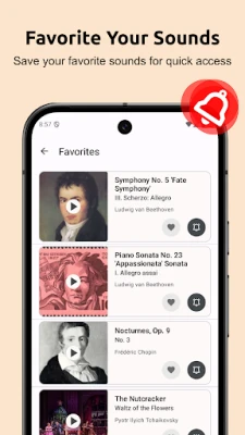 Classical Music Ringtones offers a stunning collection of 122 high-quality classical music sounds, bringing the timeless beauty of orchestral masterpieces directly to your device. Whether you're a fan of the dramatic symphonies of Beethoven and Tchaikovsky, the elegant piano sonatas of Mozart and Chopin, or the intricate harmonies of Bach and Vivaldi, our app has a sound for every classical music lover.