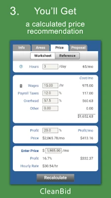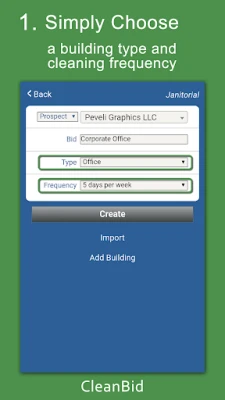 • Fast and Easy! Give the bid a name, pick a building type, choose a cleaning frequency - you’ll get a suggested price and professional proposal.