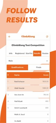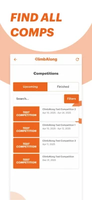 Key Features: - Create your profile with competitor details, photo, and social links - See all your past, current, and upcoming competitions - Register for events online or by scanning a QR code - Self-score as a climber or submit scores as a judge - Follow results updating live for each competition - Find results from any competition using ClimbAlong